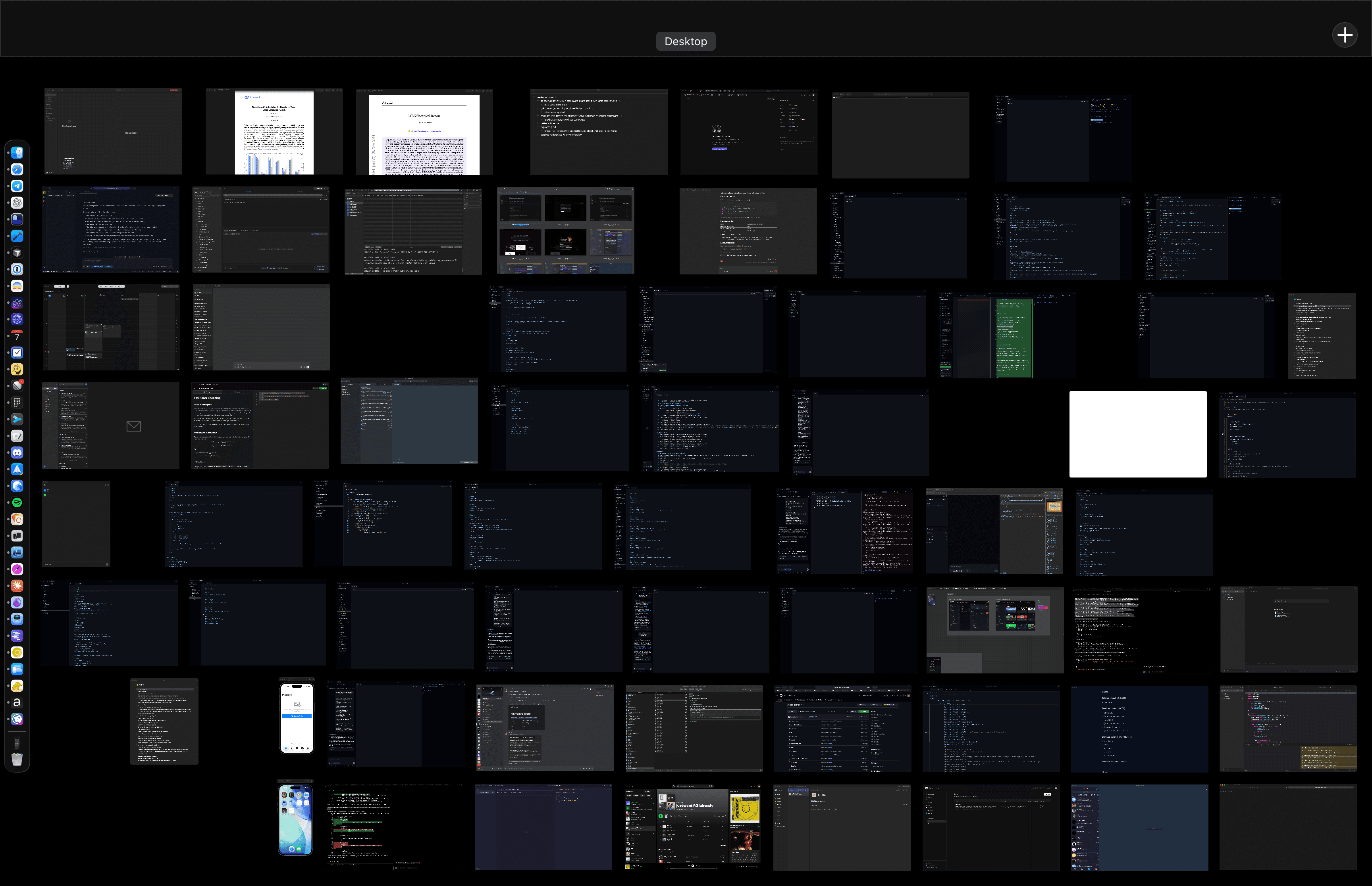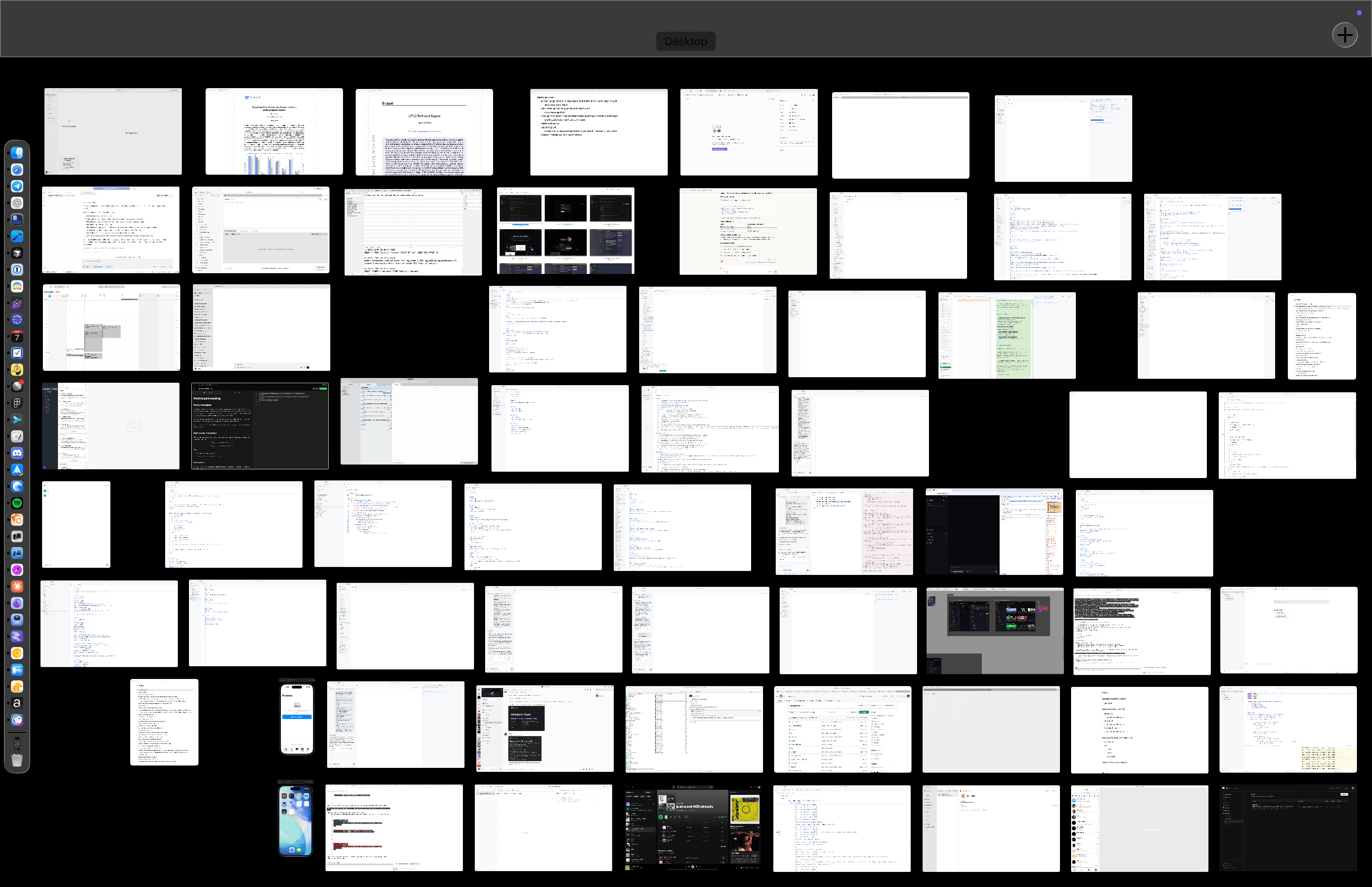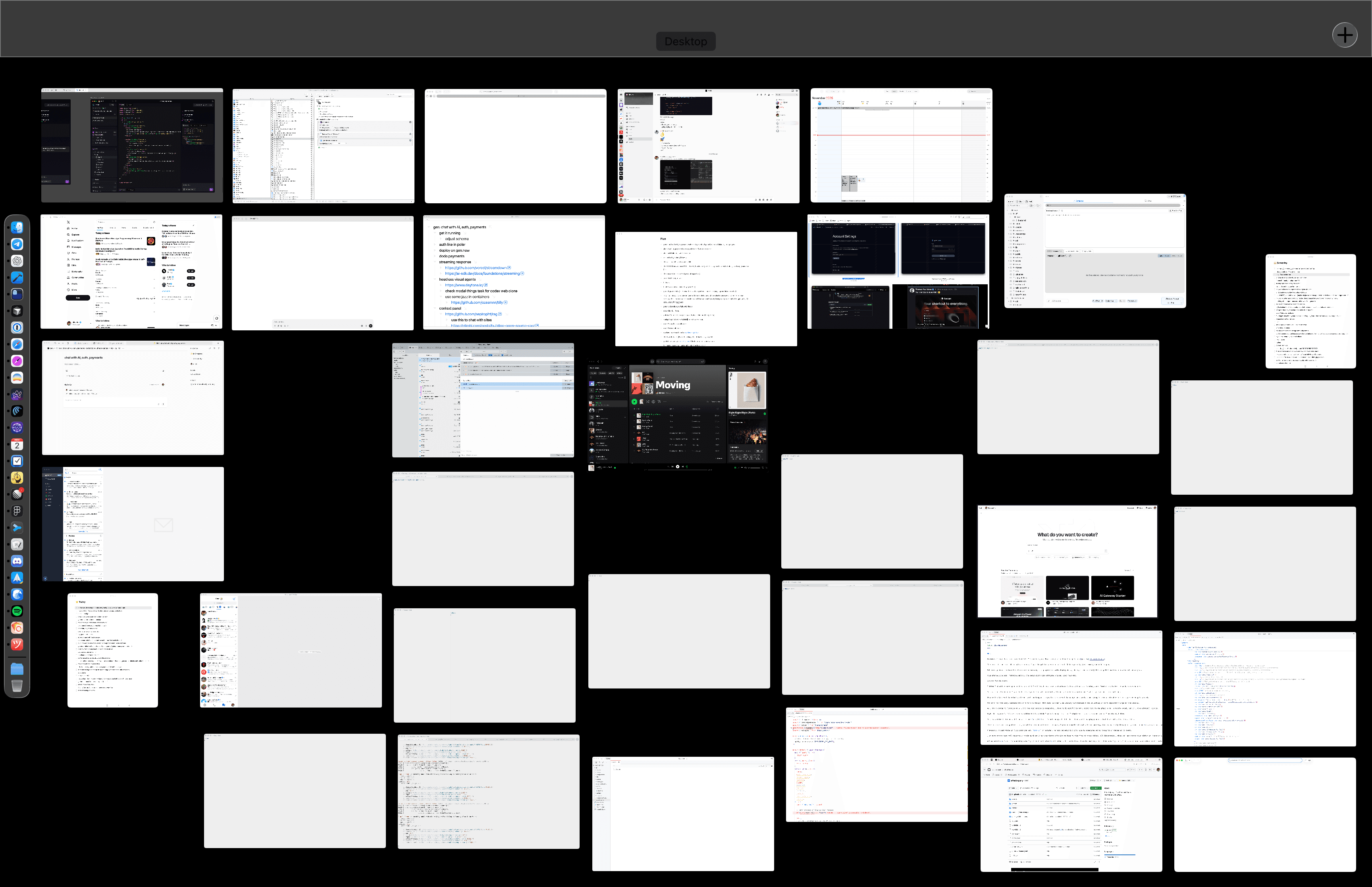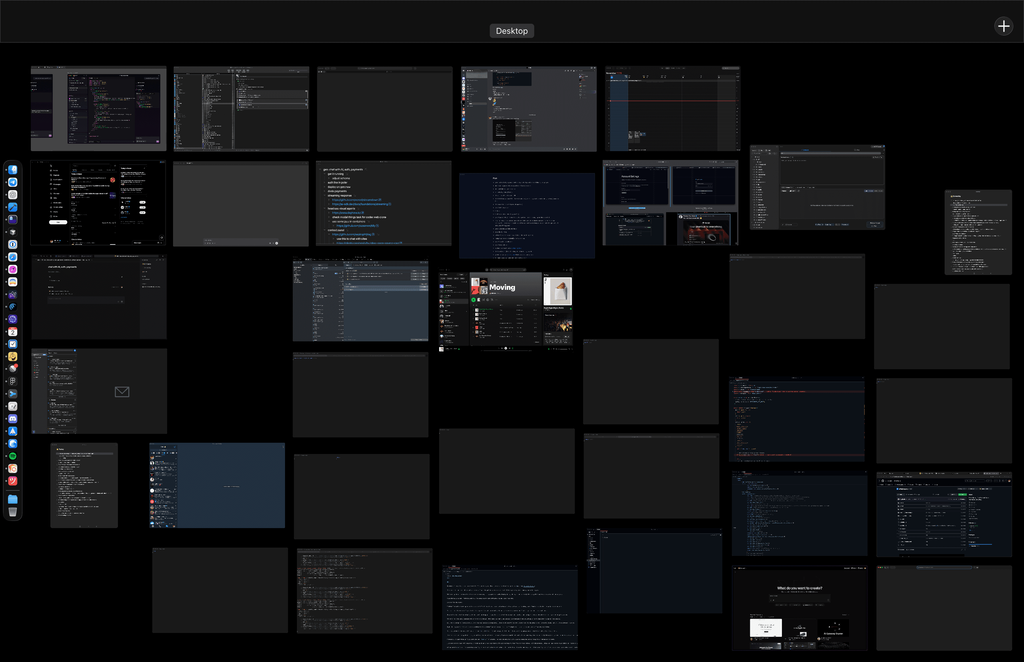 Dark appearance. All apps are in one desktop since there is delay in switching between macOS multiple desktops. Dock is hidden.